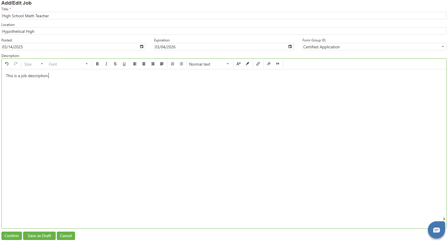 Step 2: Make the necessary changes to the Job posting and click on the Confirm button to save the changes OR click on the Cancel button if the user does not wish to save the changes. To save changes without submitting the job, use the Save as Draft button.