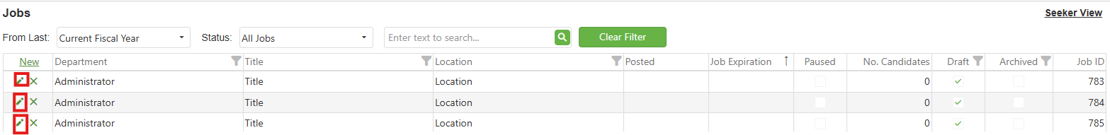 Step 1: Select the Edit (pencil) icon which is on the Job page’s Grid (as indicated below by the red outlined box) to edit an existing job.
