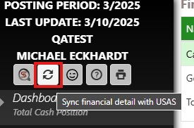 To Sync your Financial Dashboard to USAS look for the refresh icon under your username on the left side of the screen.