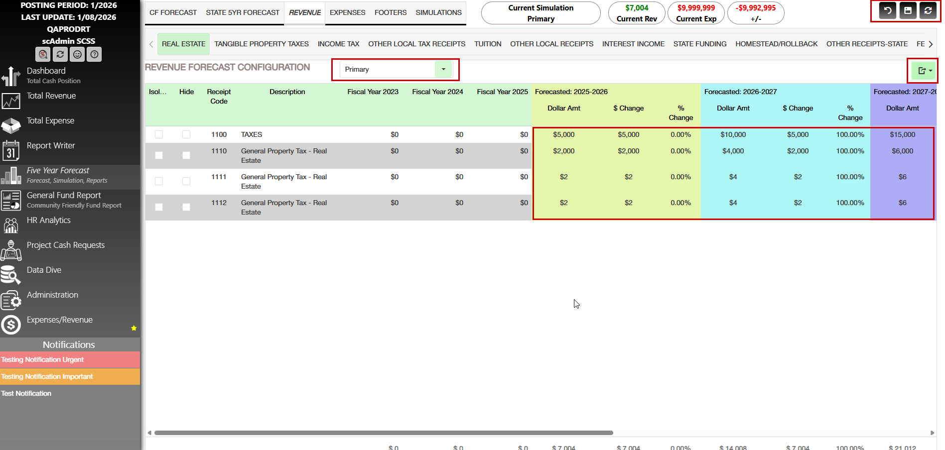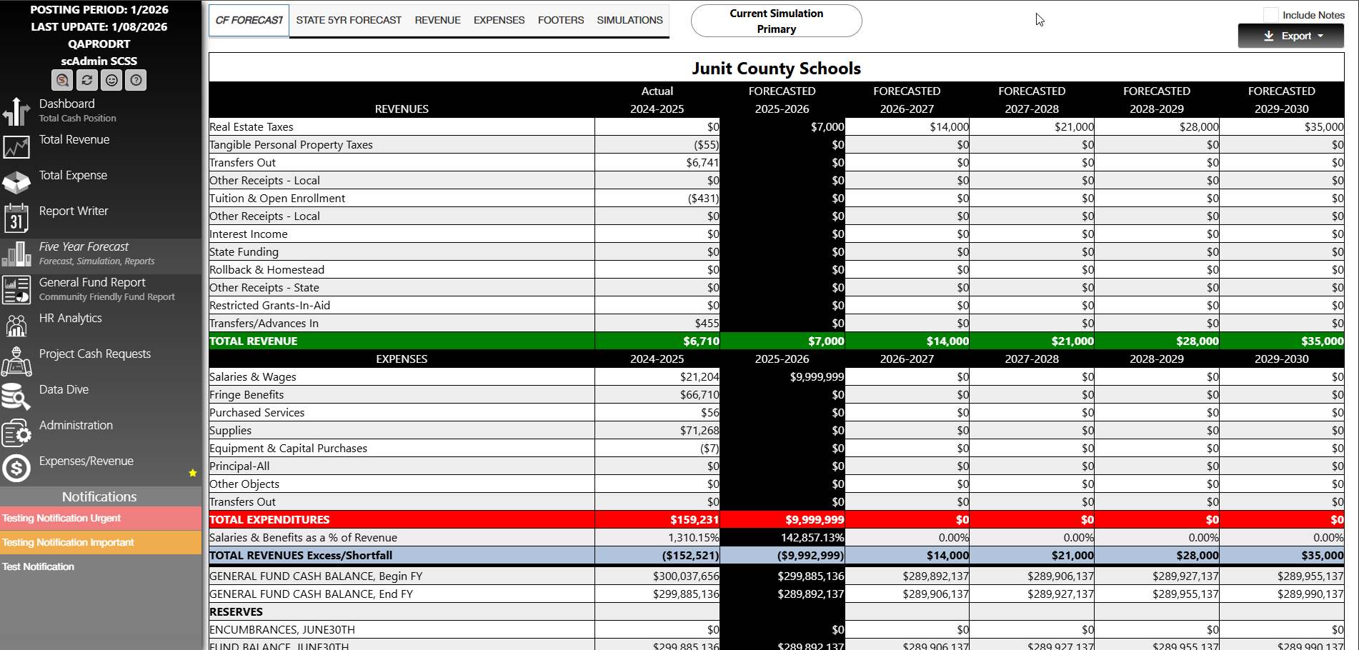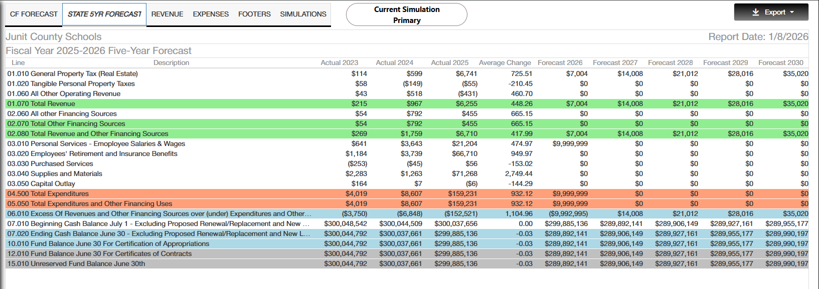 - State Five Year Forecast displays with color-coded highlighting by category.