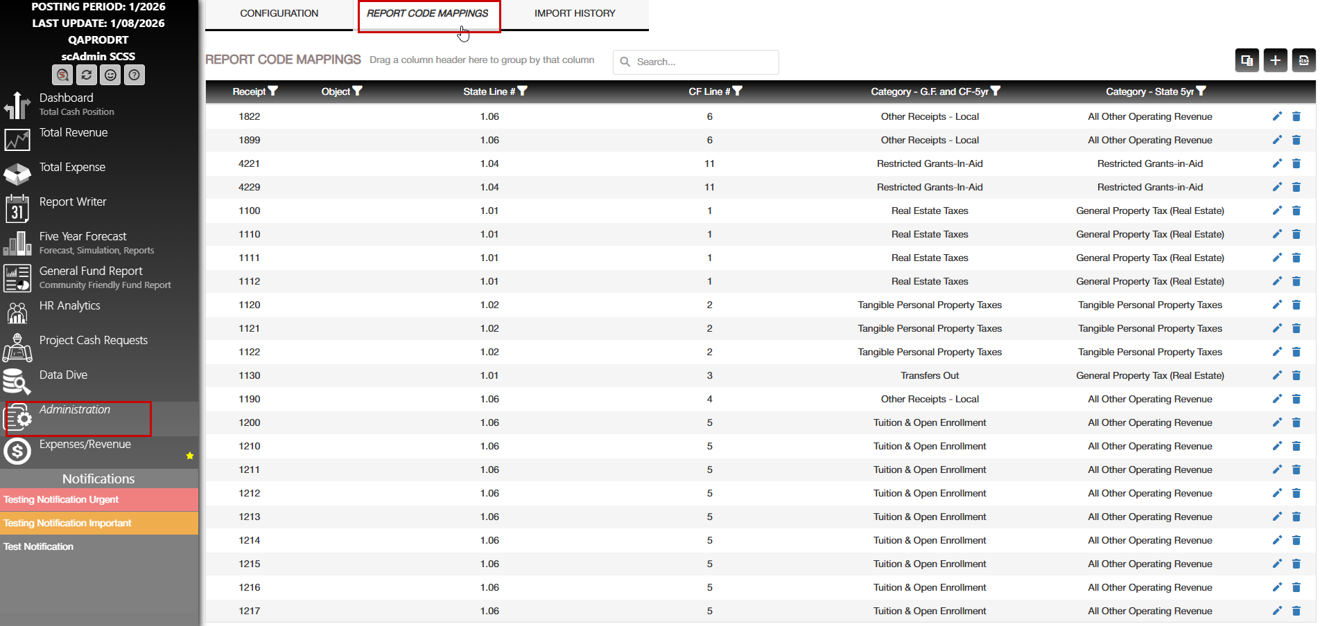 The Expense tab follows the same functionality as the revenue tab. The only difference is Active tabs are highlighted in a light red/pink. The data will display here that is set up with the Report code mapping in the administrative tab.