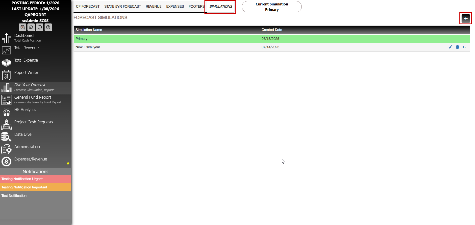 You can edit the simulations on the last tab of this page. Either click the plus icon to add one or use the pencil icon to edit an already existing one. If you are editing an already existing one, you will not be able to check or uncheck the New Fiscal Year box; however, you will be able to edit the name. Whichever simulation you have selected as your primary simulation will be highlighted green and display in the "Current Simulation". To make a simulation your primary click the "Key" icon.