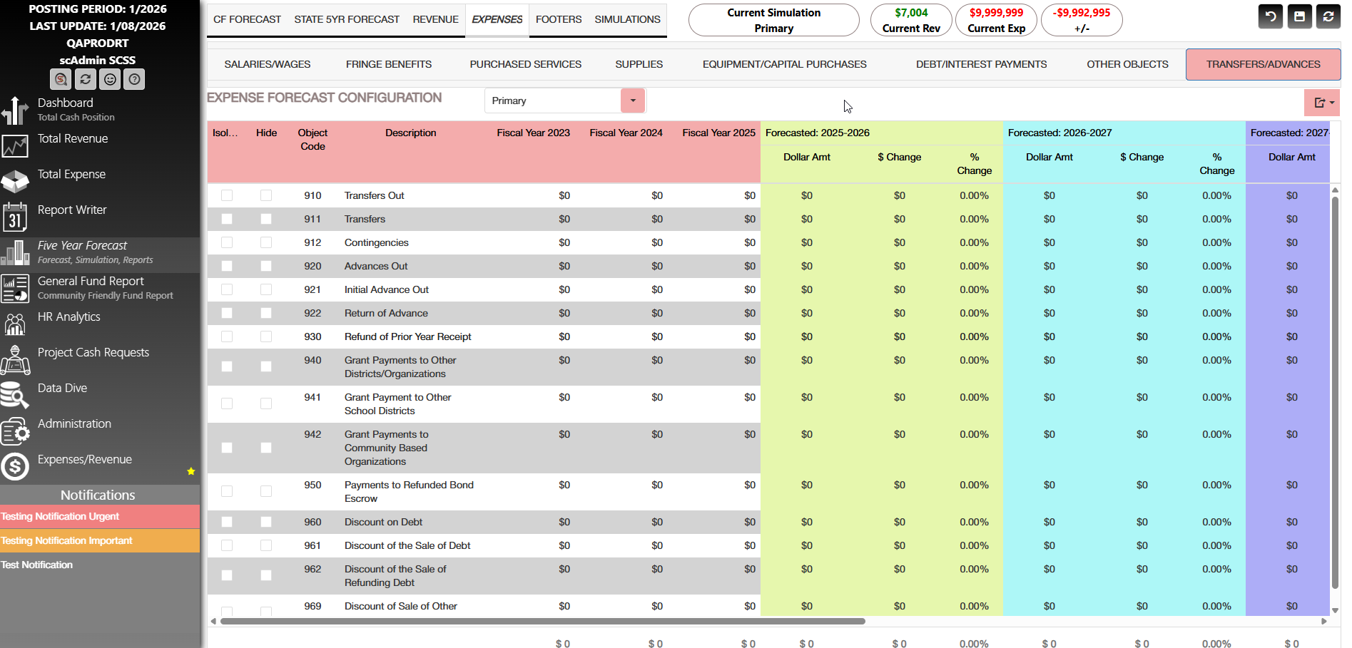 The five year forecast allows you to see forecasted revenue and expense with tools to adjust descriptions, validate forecasts against USAS/FIS data, and detailed simulations for assessment.
