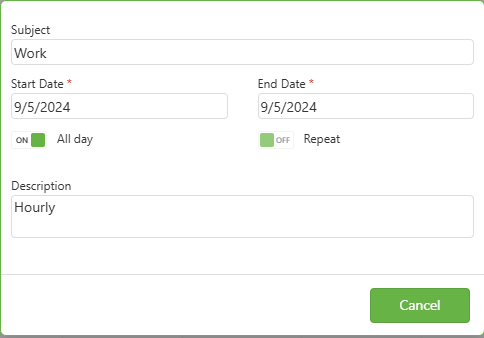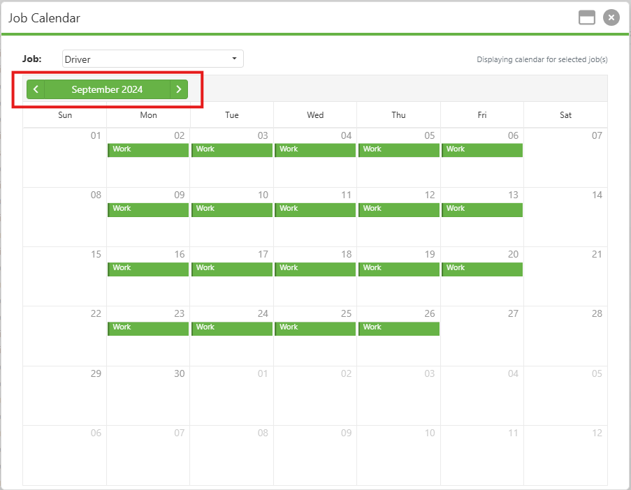 Job - This dropdown allows the user to select any of his currently active positions. For users with multiple active positions, an "All Jobs" option is available to view the composite job calendar of all jobs at once. If the user only has one job, then this dropdown will be disabled and that job will be automatically selected.