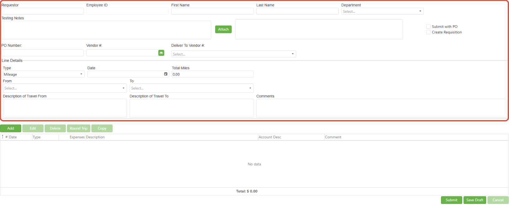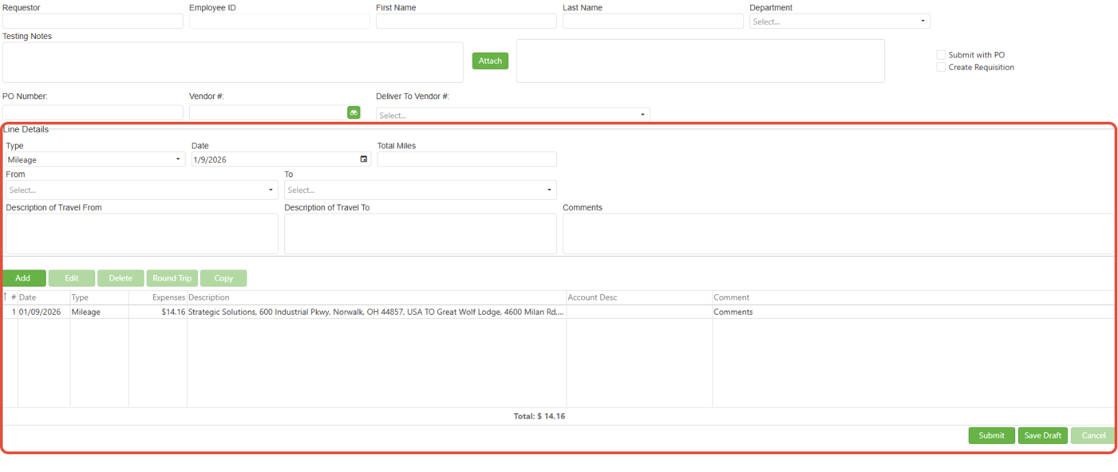 - Submit with PO: If enabled, check this box to attach the mileage to an existing Purchase Order