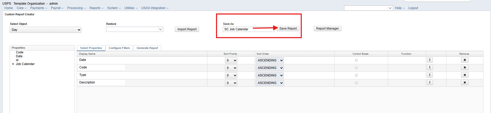 - If the report is saved with an incorrect name, an unwanted custom report will be added to USPS; contact your system administrator to remove it and repeat Step 4 with the correct name