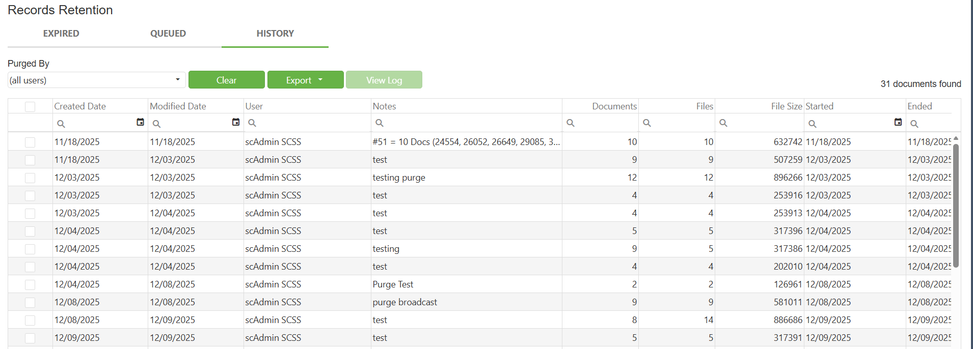 Because Records Retention is intentionally manual (scan, queue, purge), the audit trail acts as the verification source of record.